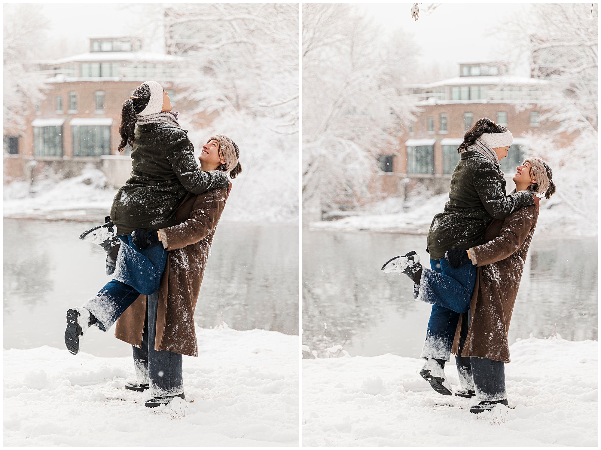 These spontaneous moments create the most memorable engagement photography. As a result, their joy radiates through every single photograph. We simply documented their authentic play and connection. Meanwhile, the snowstorm provided the most romantic natural lighting.