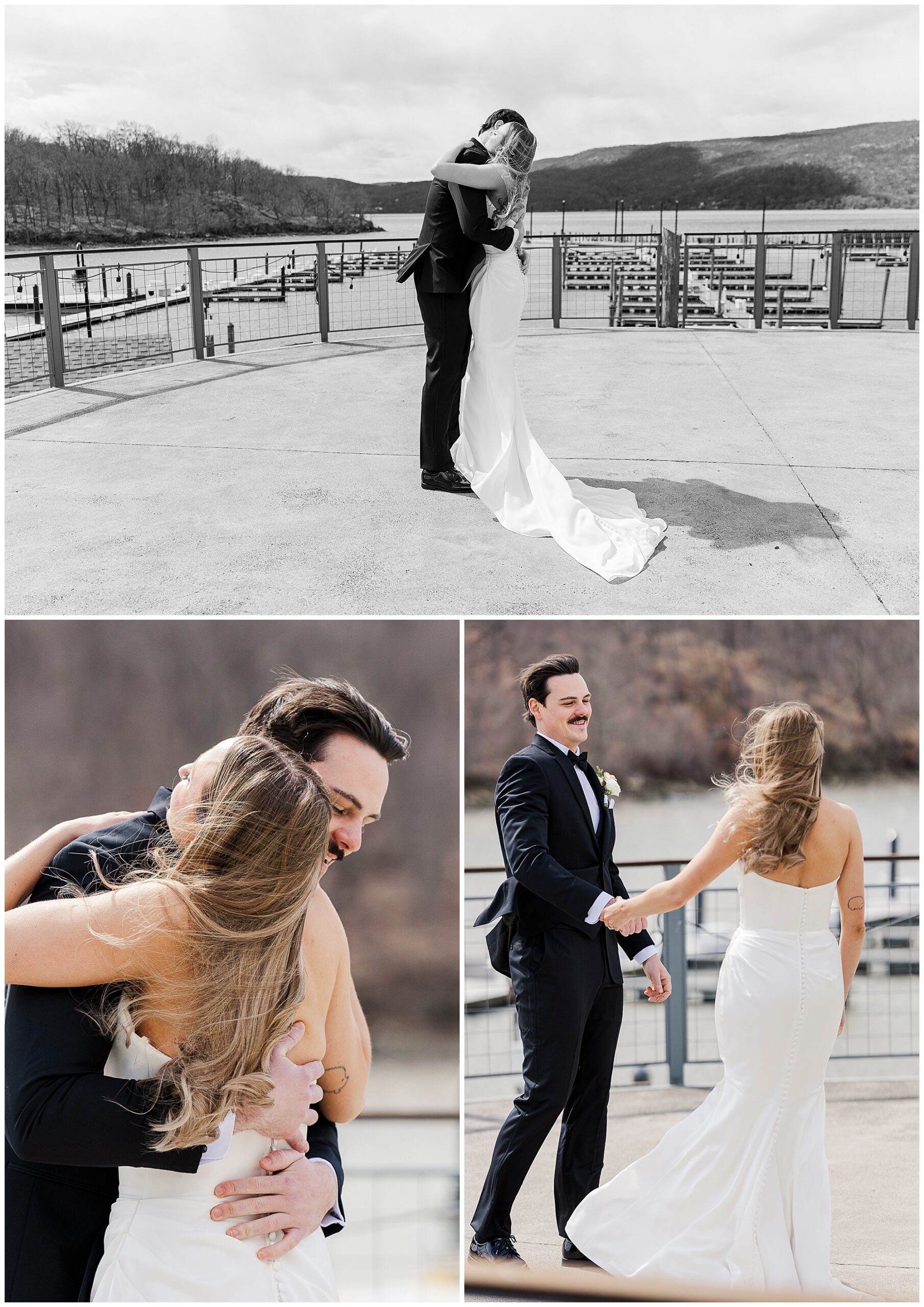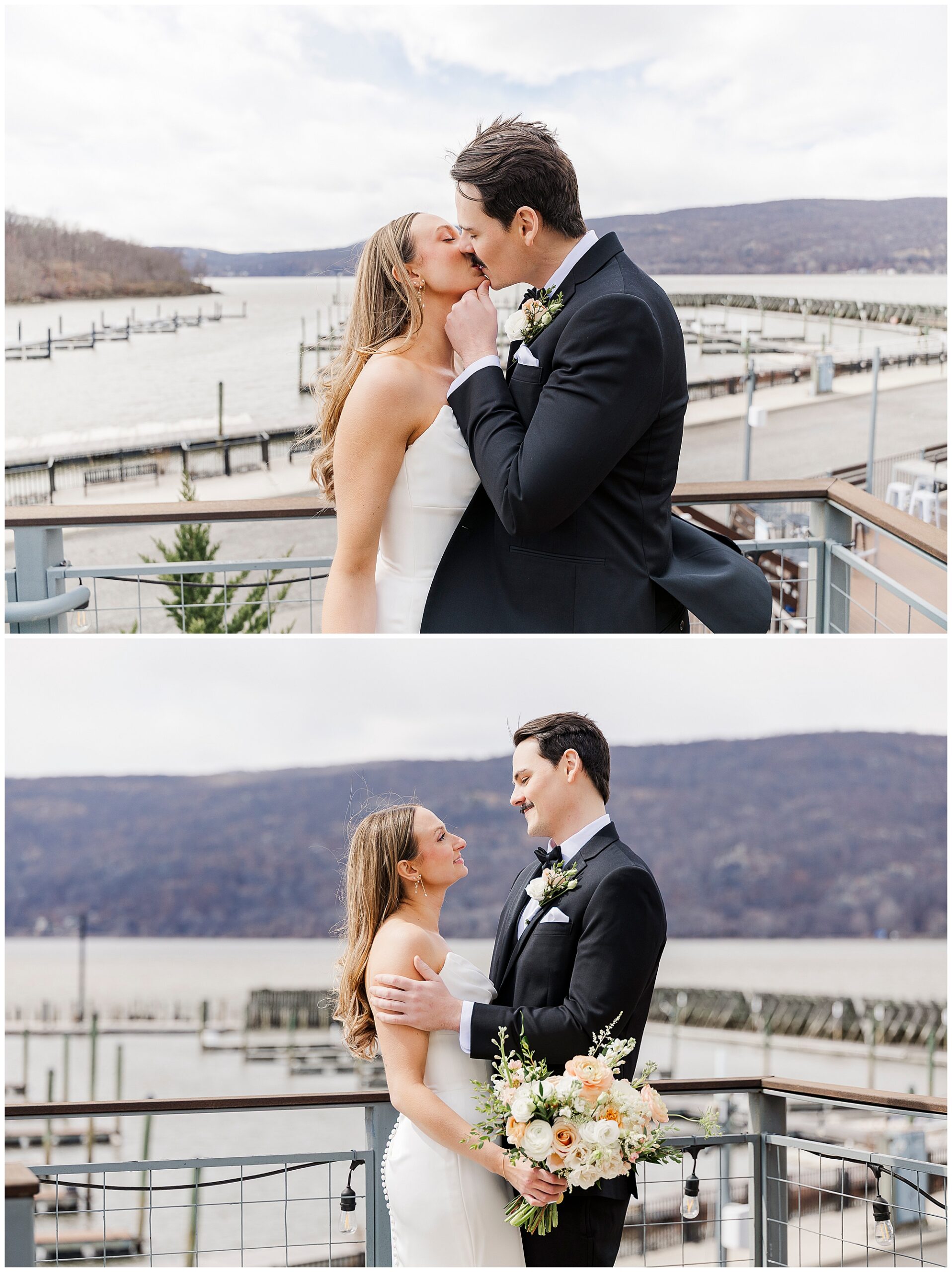 The first look took place on the outdoor balcony, right above the marina and the wide Hudson River. The morning was chilly and windy off the water, but Jess and Rob were completely lost in each other. The fresh spring sunshine and cool river air made this such a genuine and truly memorable moment for them. Couples planning a Peekskill or Hudson Valley wedding will absolutely love this balcony for their own first look.