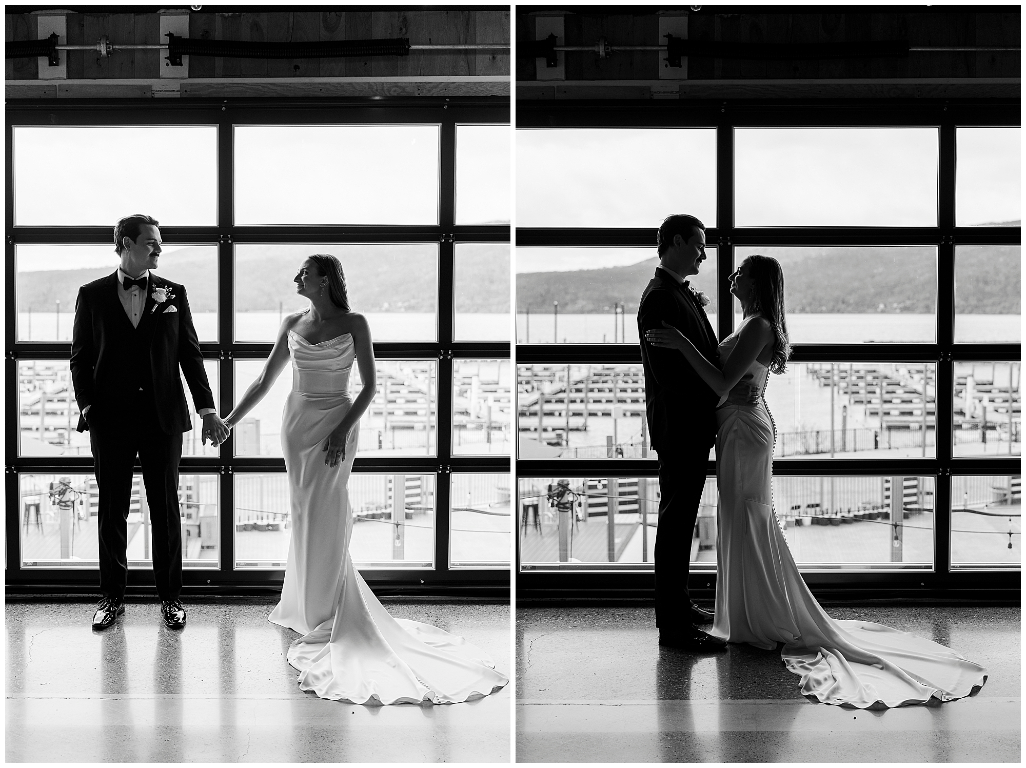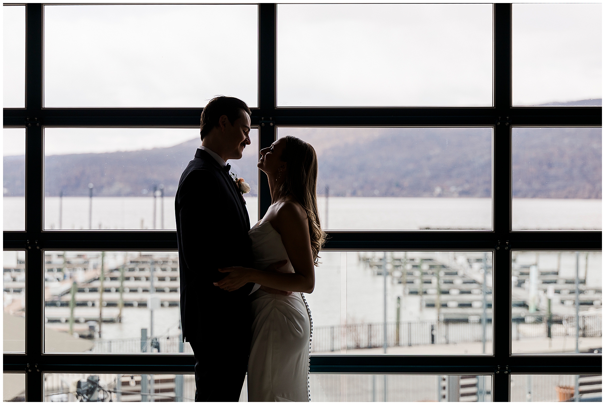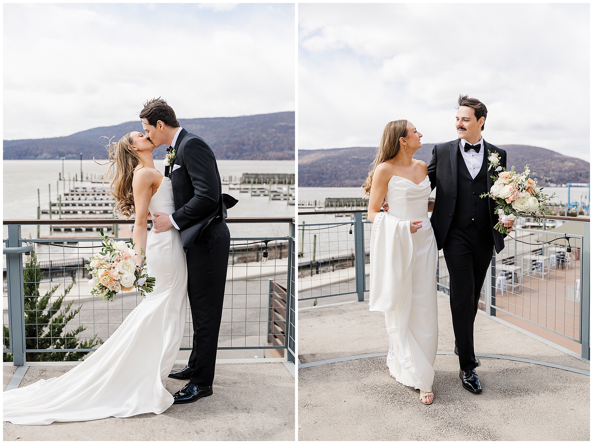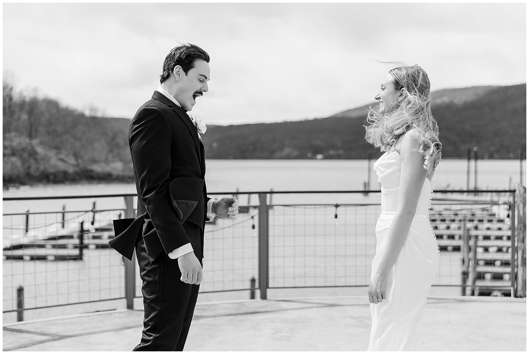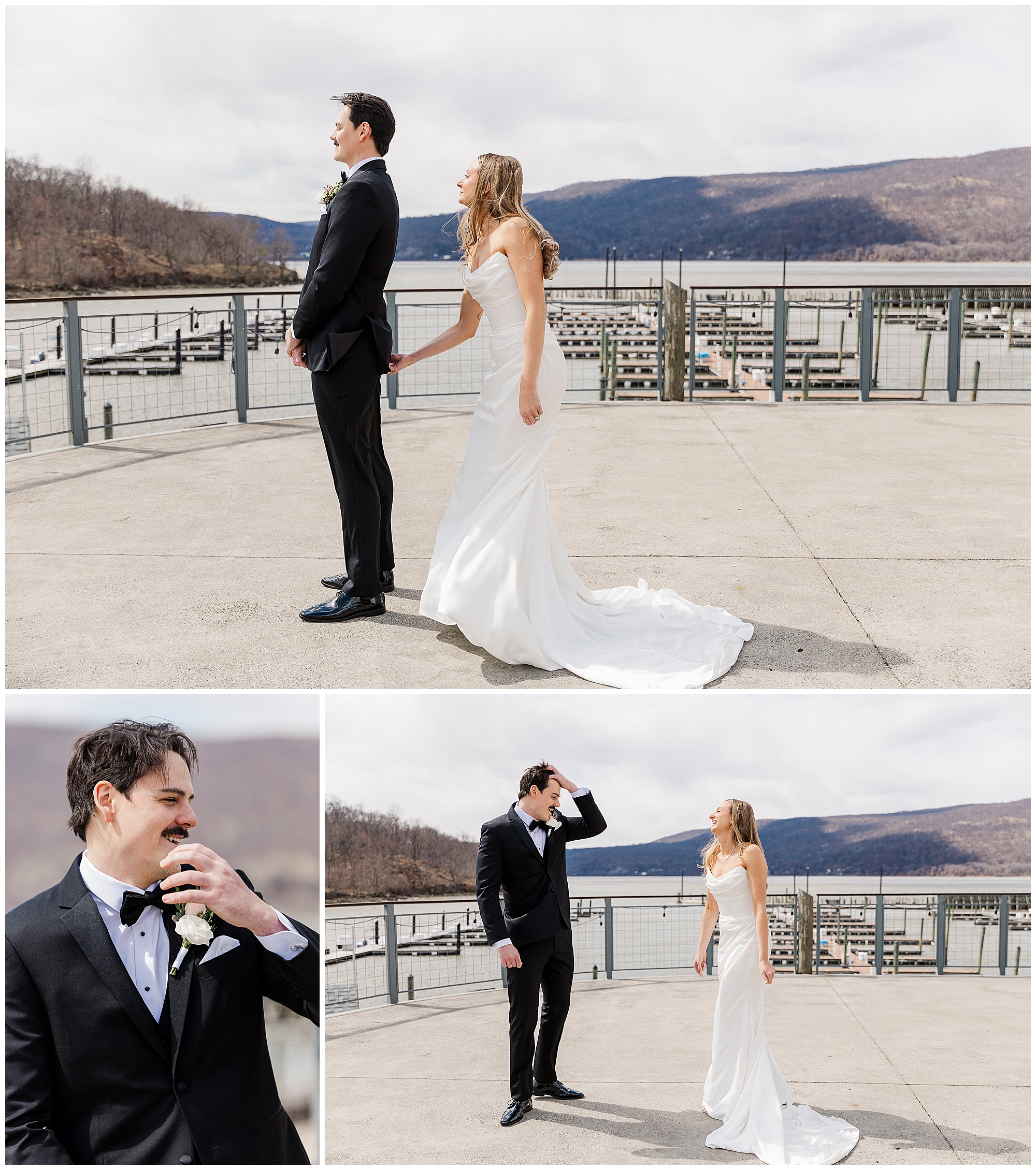 The first look took place on the outdoor balcony, right above the marina and the wide Hudson River. The morning was chilly and windy off the water, but Jess and Rob were completely lost in each other. The fresh spring sunshine and cool river air made this such a genuine and truly memorable moment for them. Couples planning a Peekskill or Hudson Valley wedding will absolutely love this balcony for their own first look.