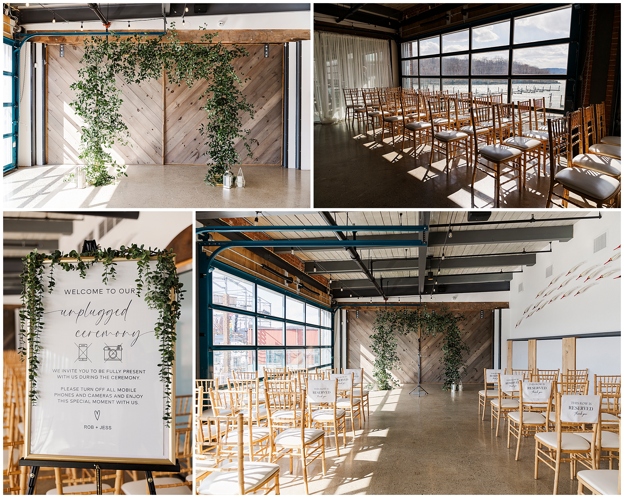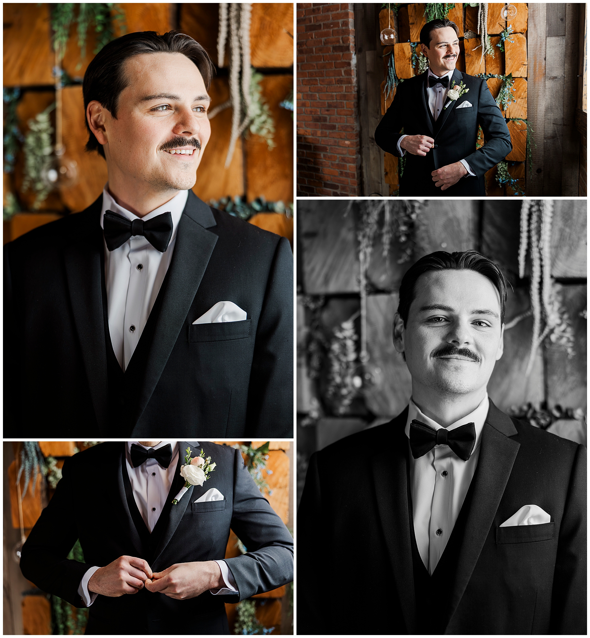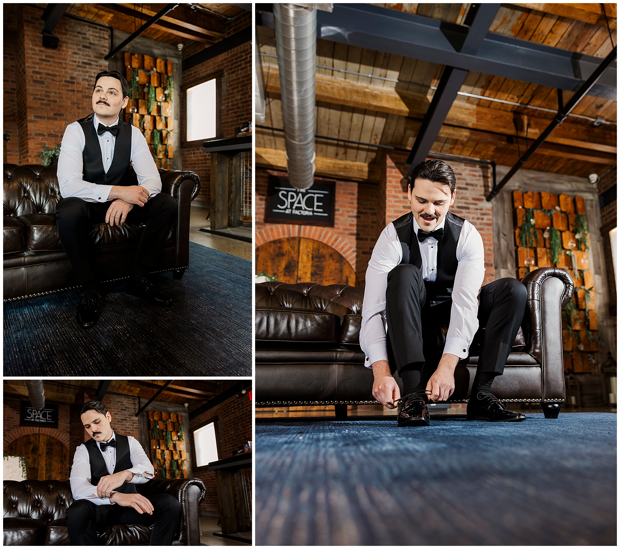 We started with Jess getting ready in her gorgeous bridal suite, which was filled with soft and beautiful light. Rob got ready in the front lobby area, which offered its own wonderful natural light throughout the space. The industrial architecture of this venue glows beautifully on a bright spring day with sunshine pouring through large windows. As a Beacon-based photography team photographing our first Factoria at Charles Point wedding here, we were completely captivated.