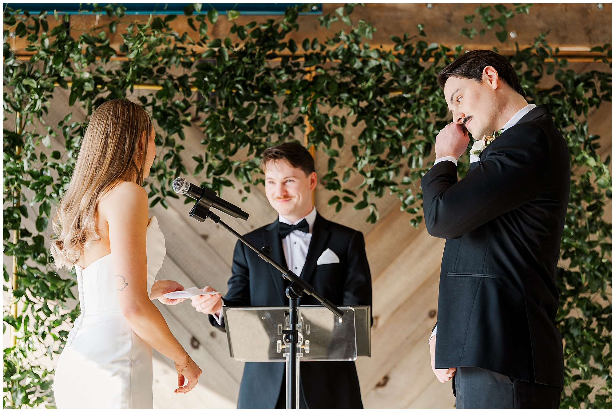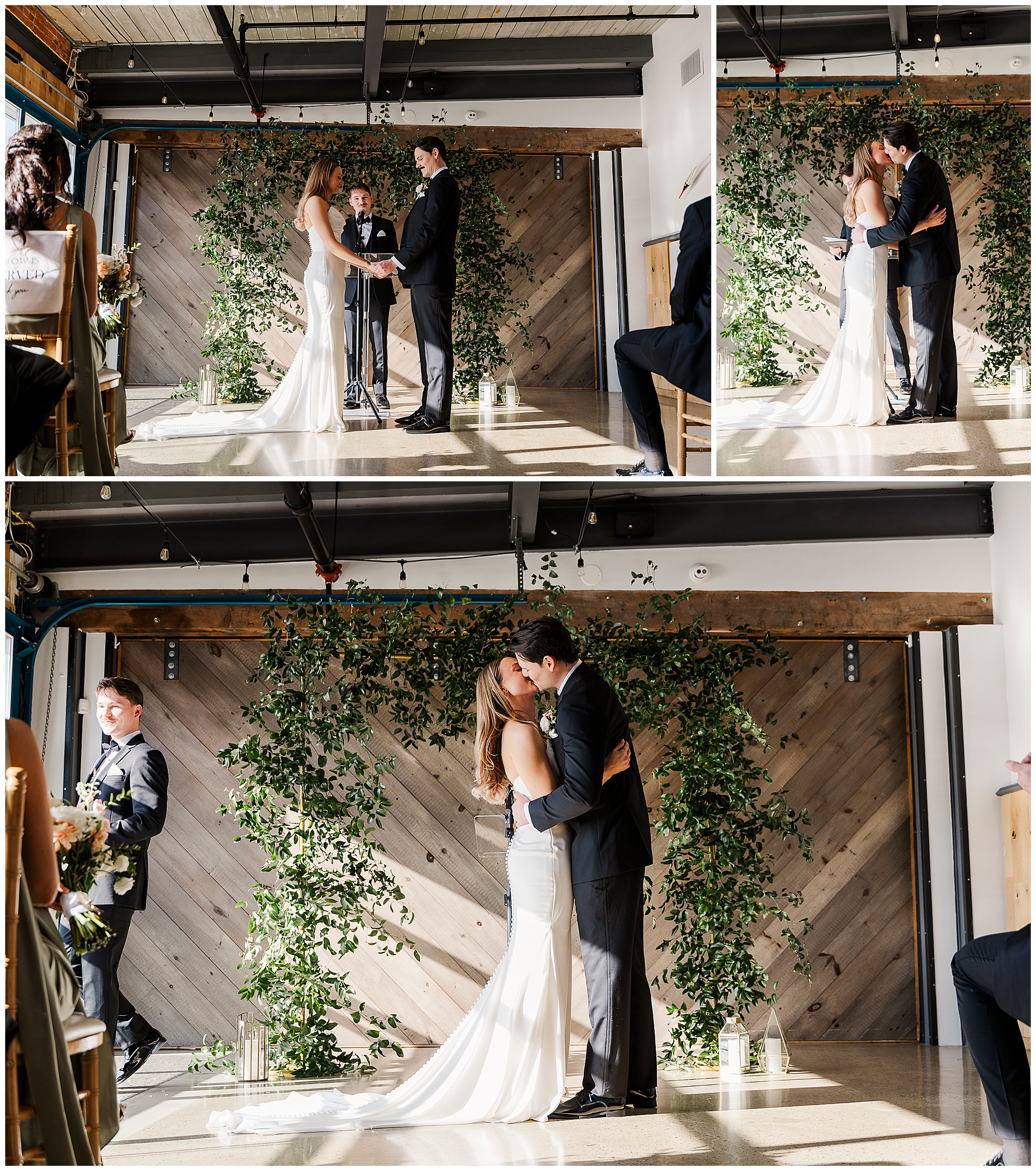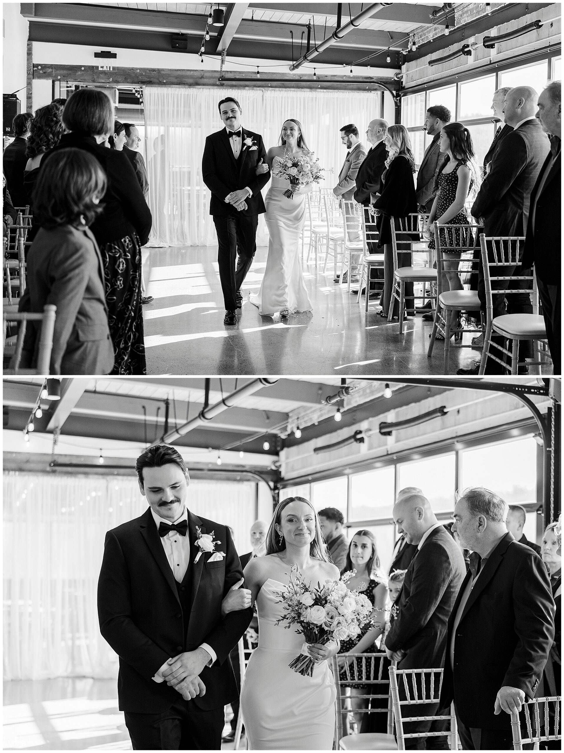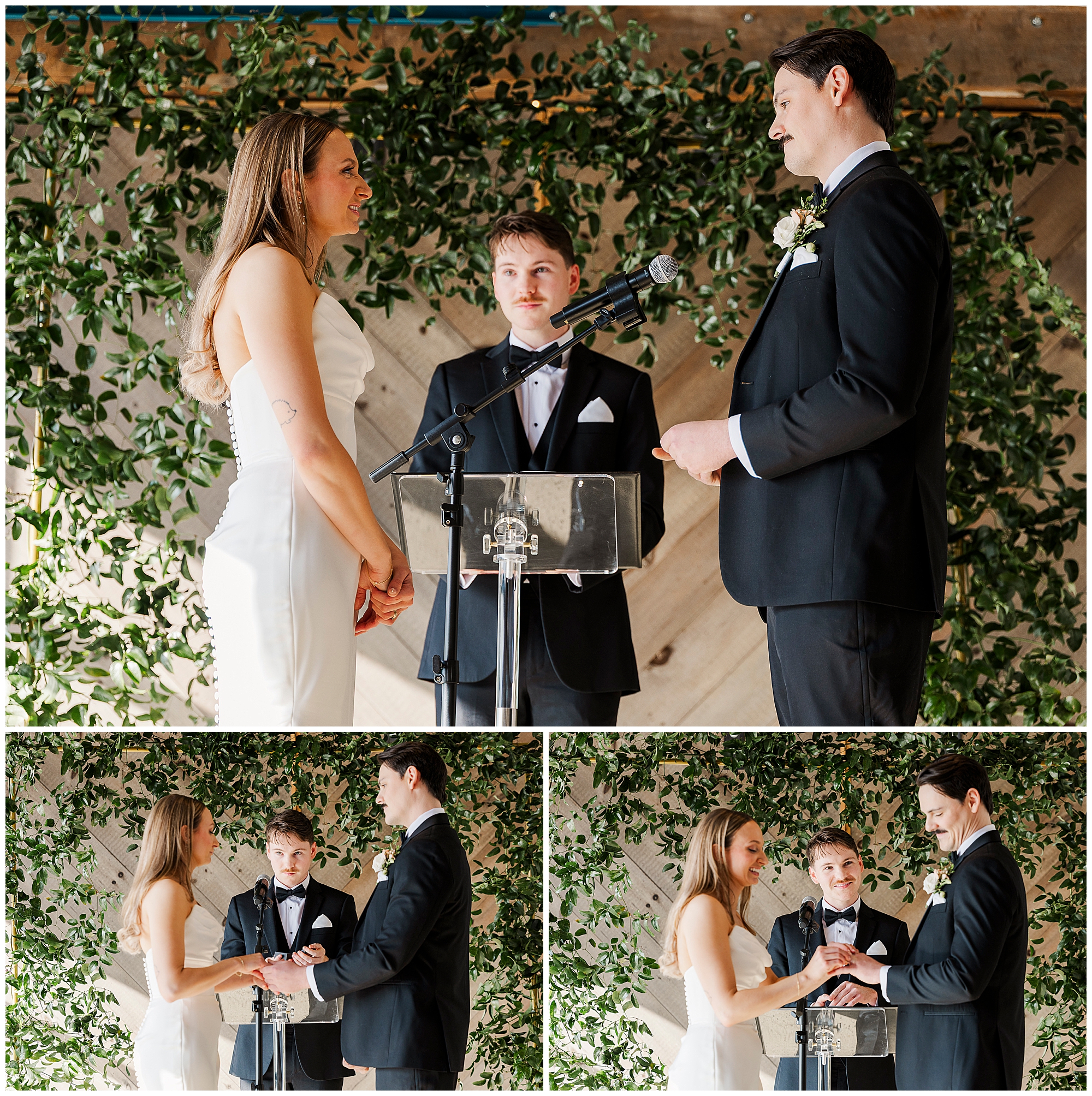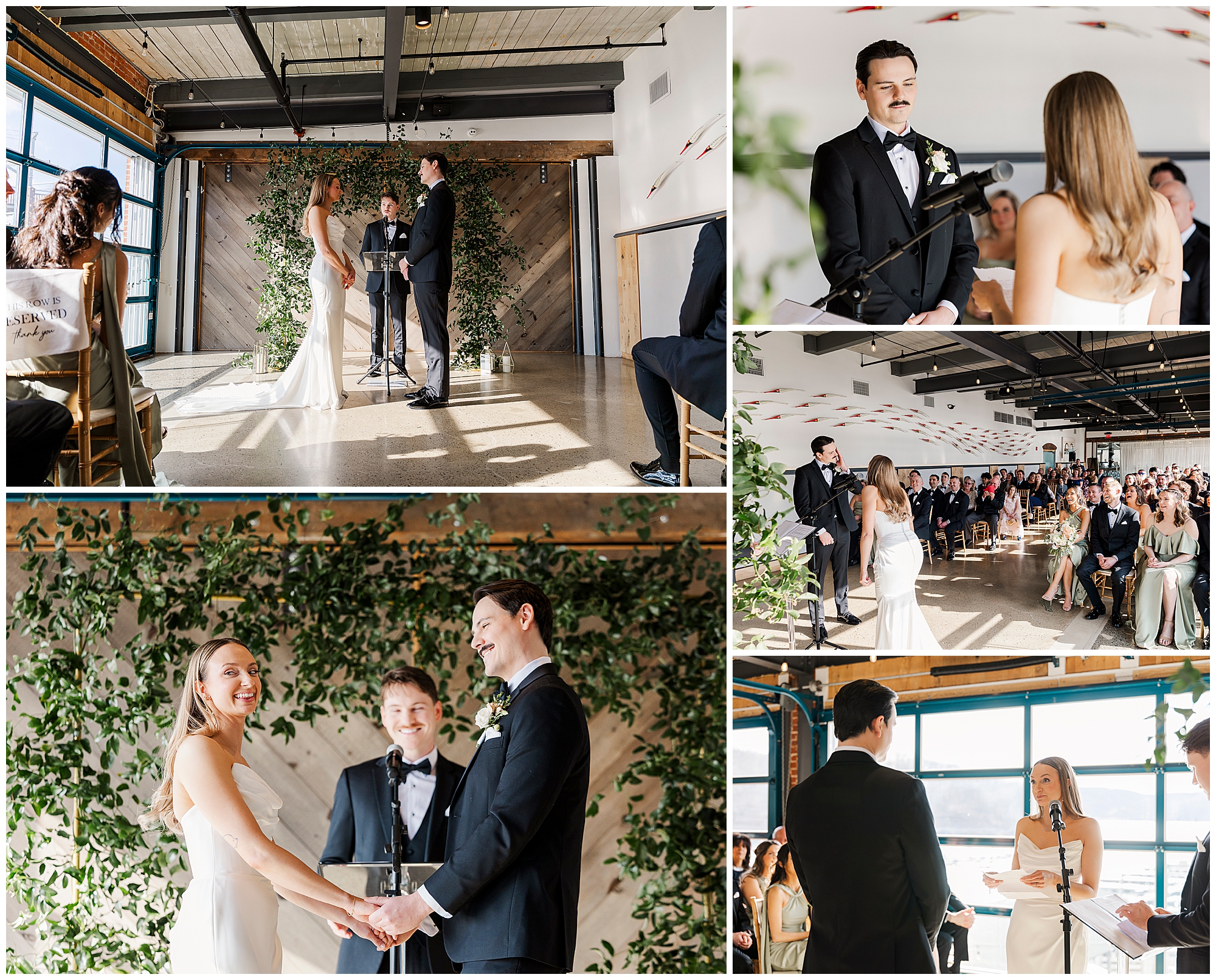 The ceremony at this Factoria at Charles Point wedding was one of the most moving we have ever photographed. Jess and Rob walked up the aisle together, which created such a powerful and tender moment for everyone present. Rob’s brother officiated and delivered words that were funny, heartfelt, and absolutely full of love for this wonderful couple. Happy tears and laughter filled the room, and we felt so honored to be there capturing every single moment.