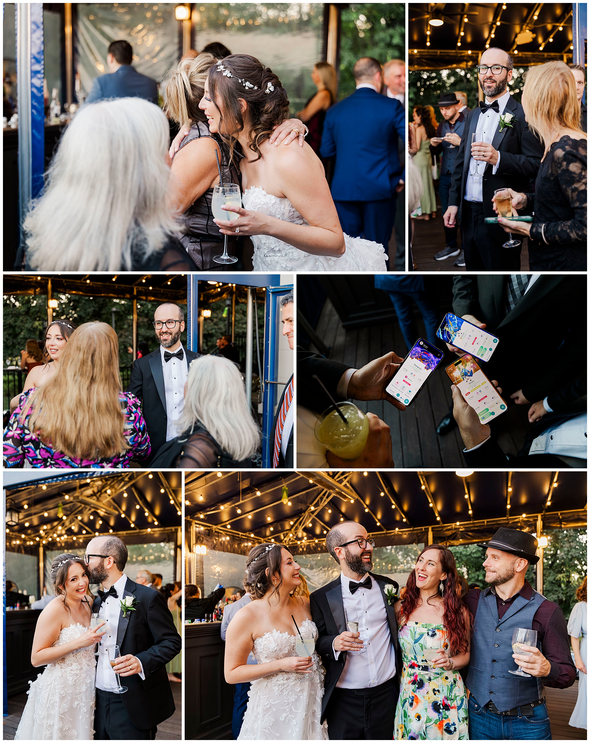 After the ceremony, guests gather on the patio for cocktail hour. The golden hour light creates perfect conditions for candid portraits. Jackie and Phil mingle with family and friends while we capture laughter and embraces. The relaxed setting allows everyone to unwind before dinner.