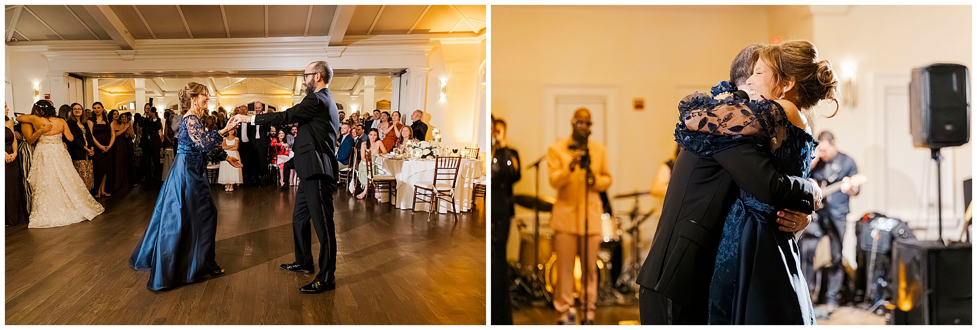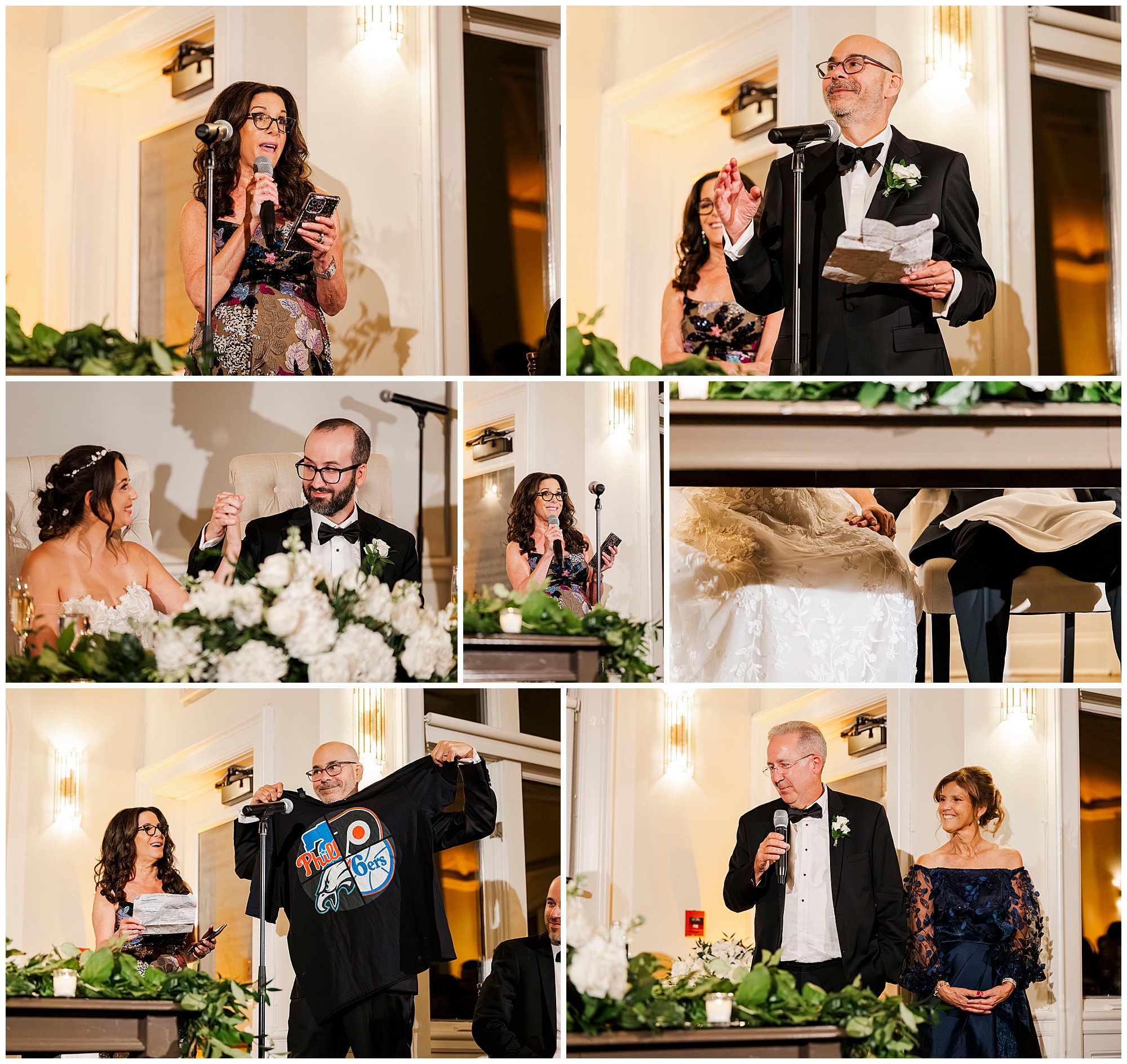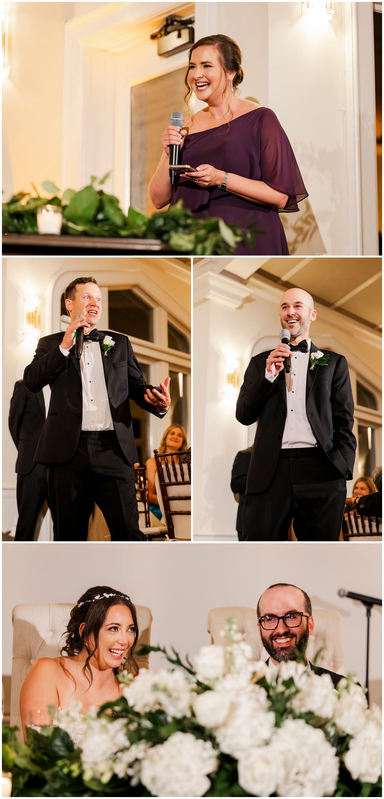 Inside the ballroom, the celebration continues with dinner and dancing. The room is elegant yet welcoming, filled with candlelight and laughter. Parents, best men, and the maid of honor share heartfelt speeches. Every detail feels intentional and full of love.