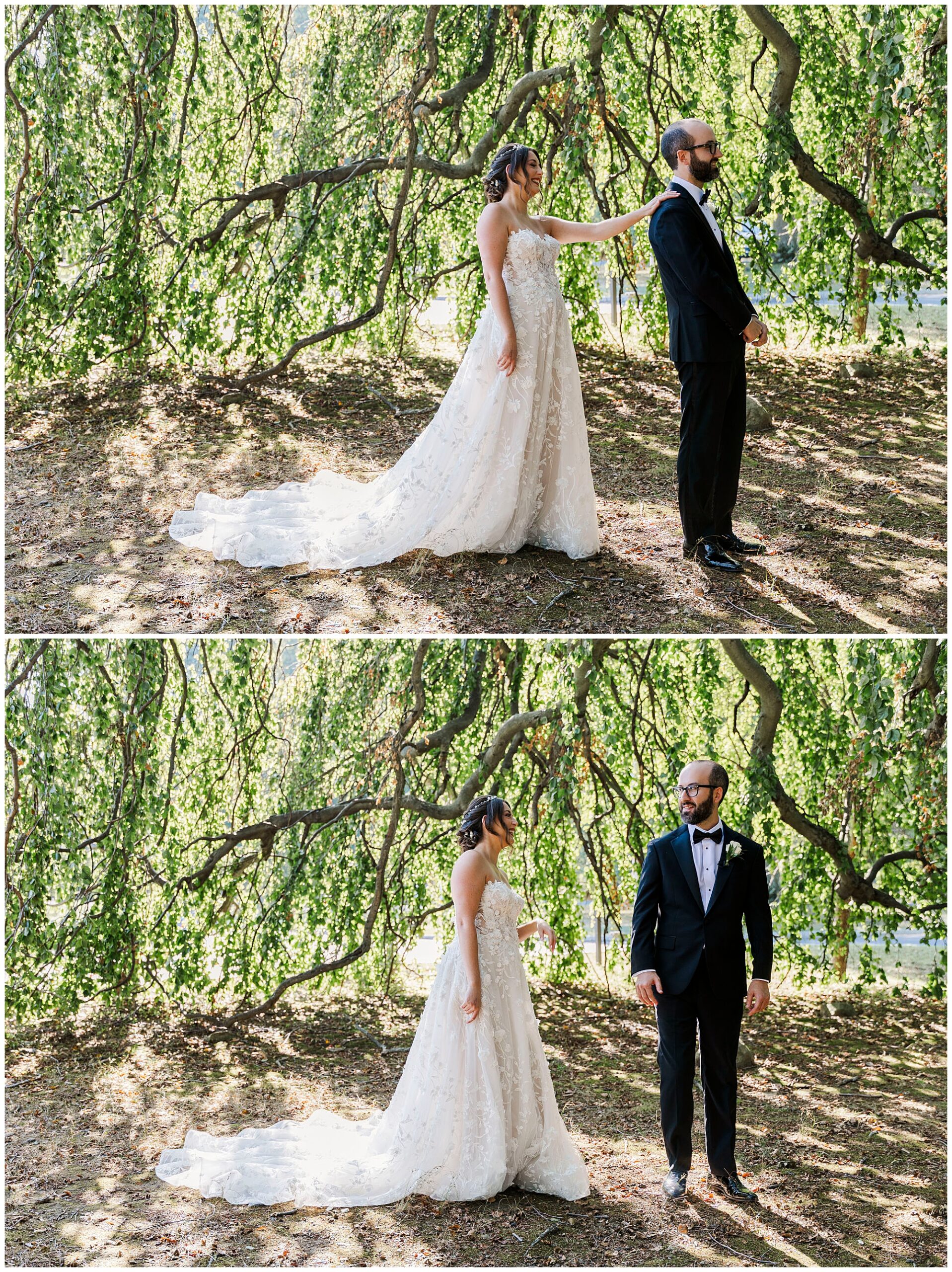 Phil waits under the iconic willow tree for their first look. This secluded spot offers shade and a touch of magic. Jackie approaches him quietly, giving him a gentle tap on the shoulder. His reaction is filled with emotion and love.
