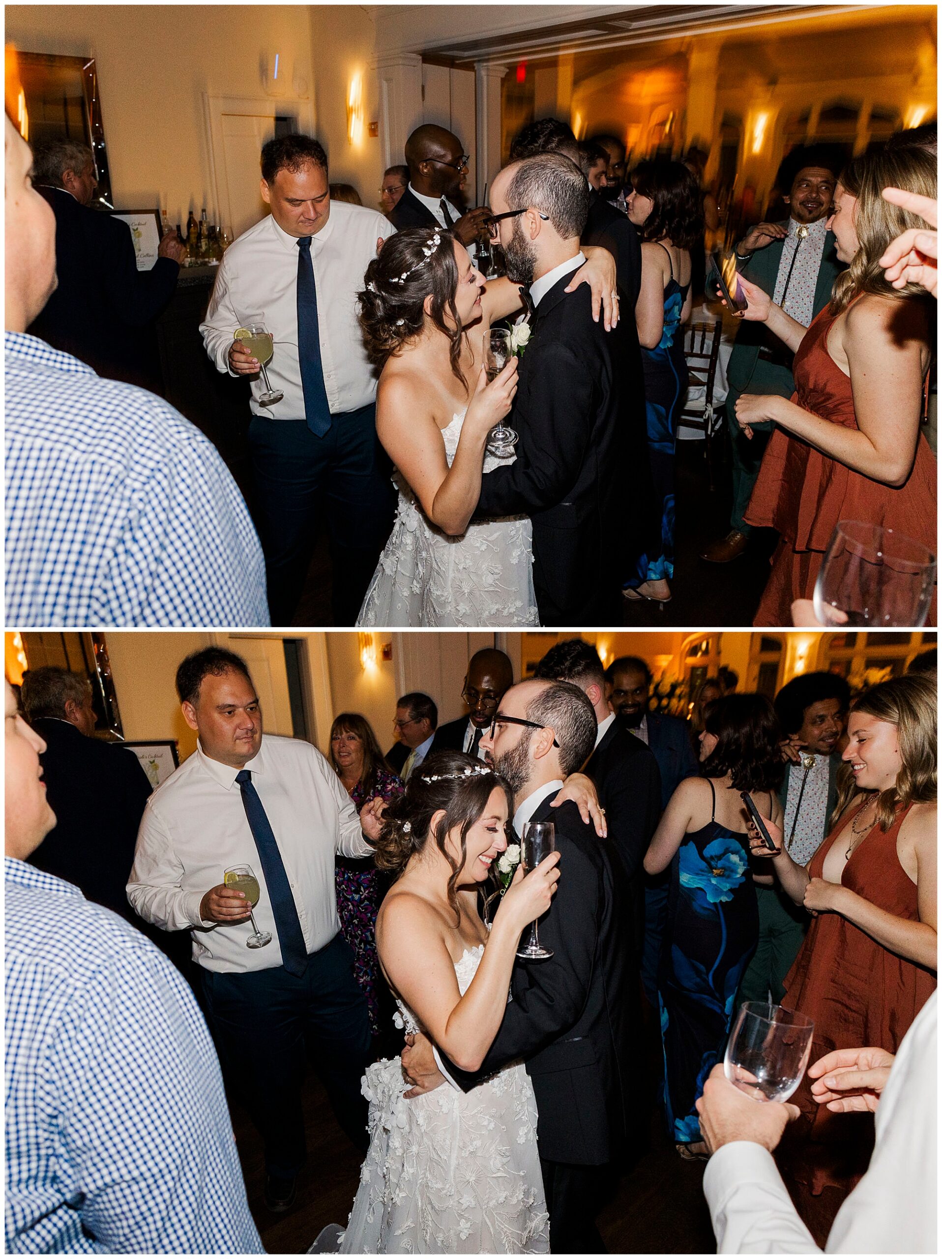 We take advantage of the sunset to photograph Jackie’s flowing veil. These soft, glowing portraits are some of our favorites. Cocktail hour photos often show pure joy and connection. It is a moment when everyone feels present and happy.