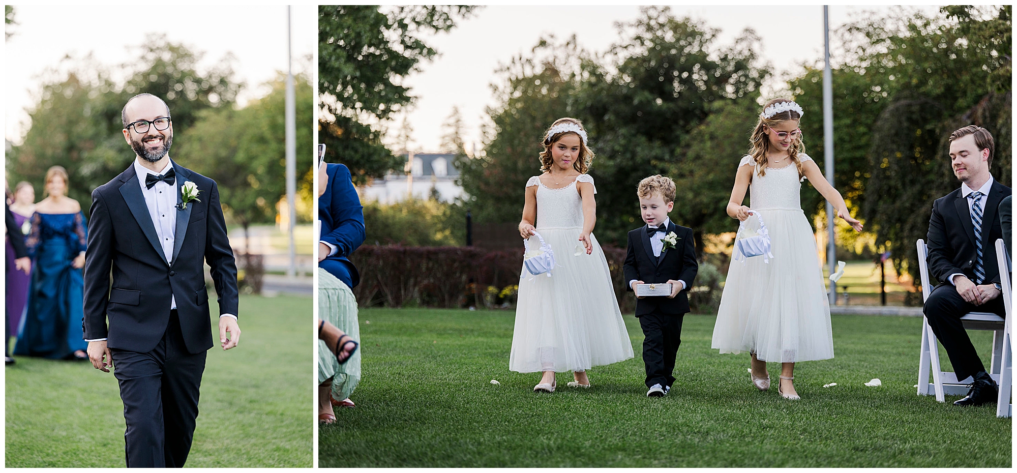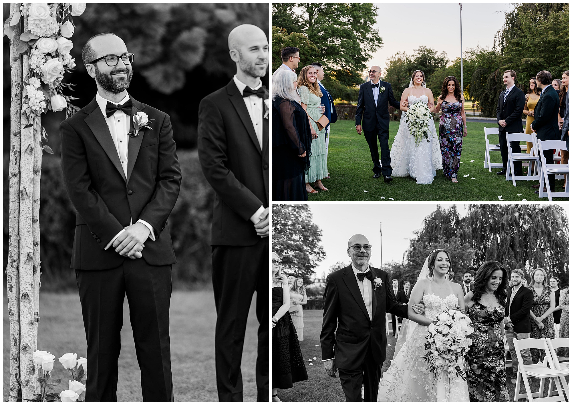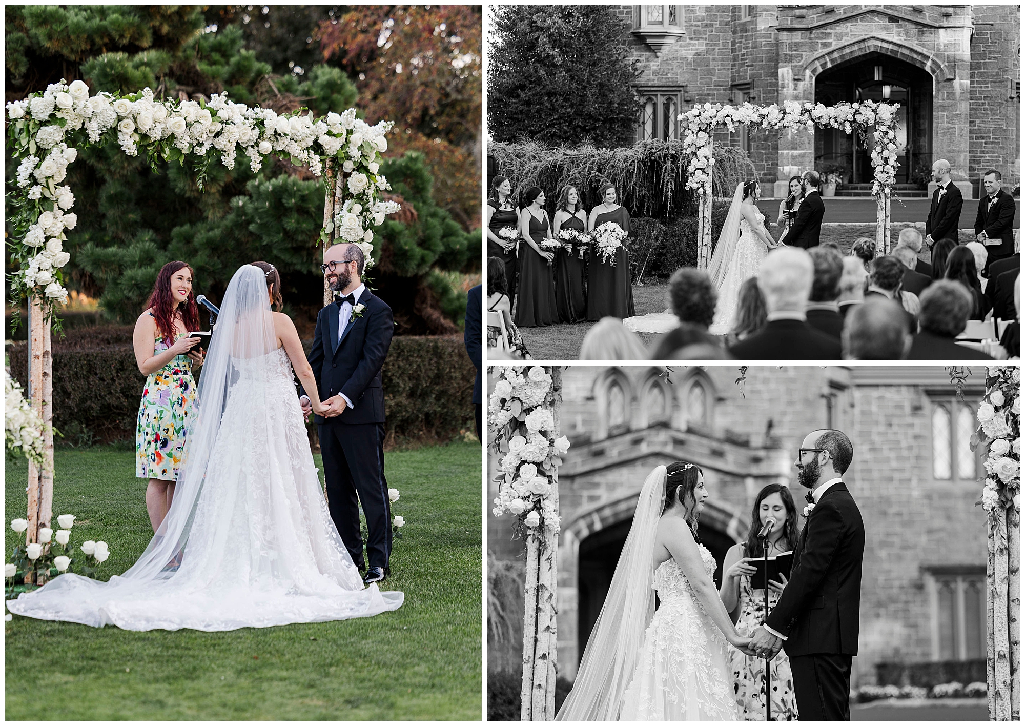 The ceremony takes place on the lawn overlooking the Sound. The couple’s karaoke MC officiates, adding humor and warmth. Music plays an important role in their story. Phil even proposed to Jackie during karaoke, so this detail feels personal and fitting.