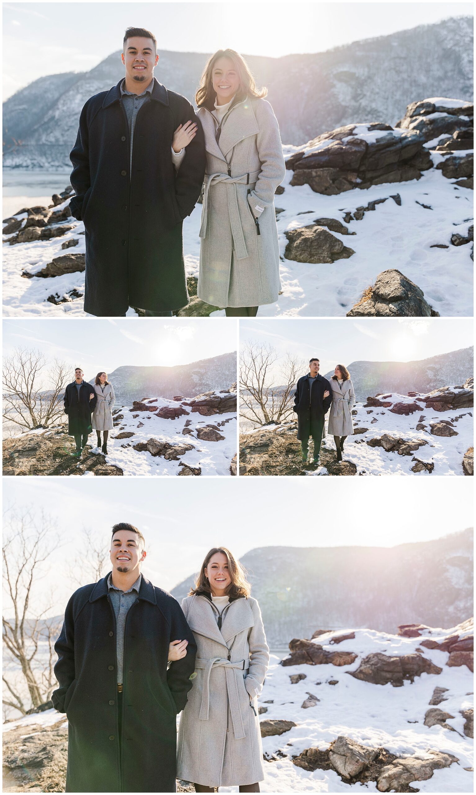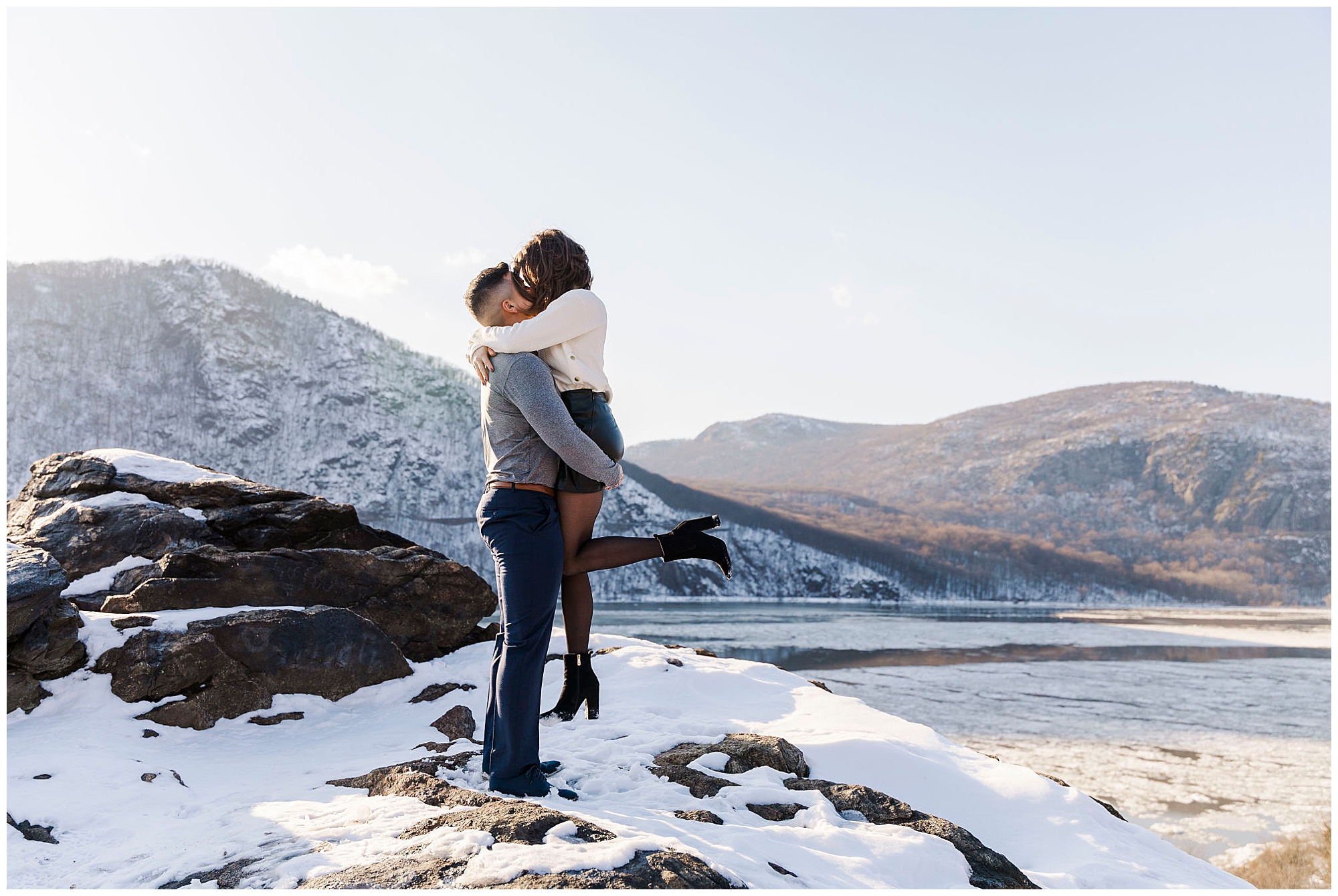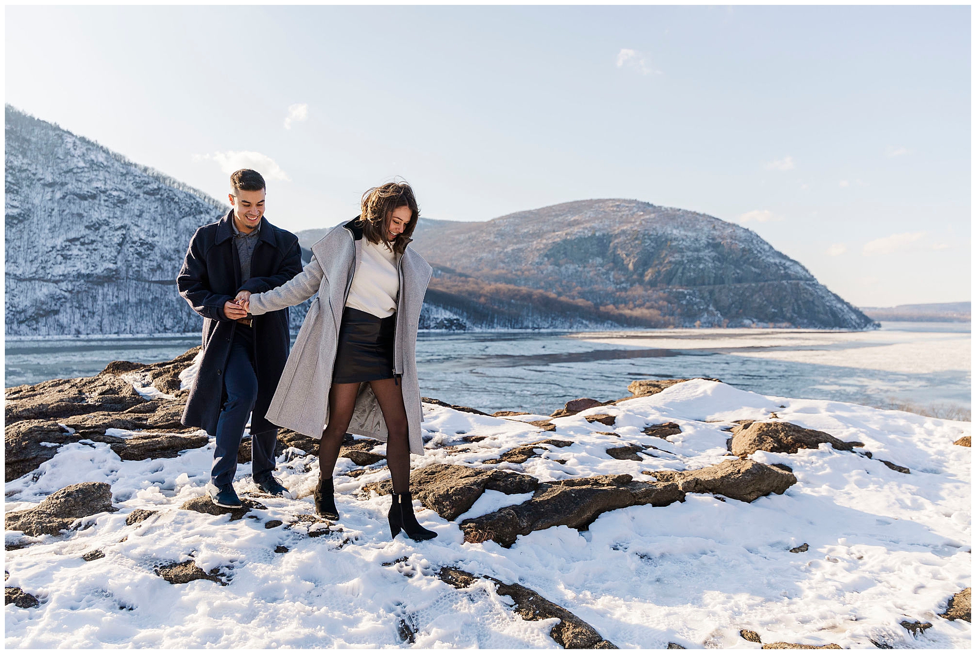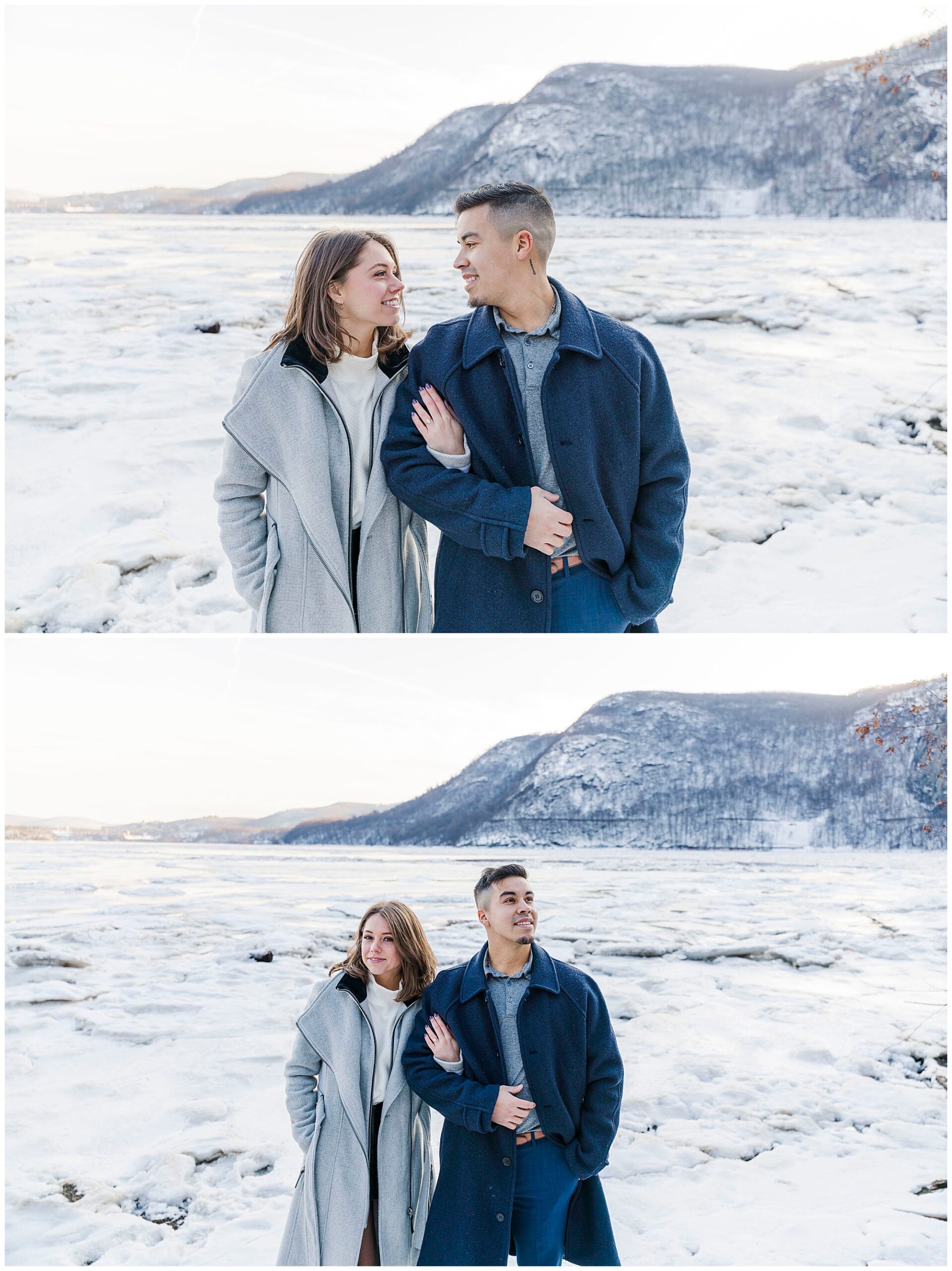 We began the session at the overlook at Little Stony Point. This is one of our favorite spots for Hudson Valley engagement photography. The view from the top is absolutely worth the climb. We could see the Hudson River stretching out below us. Ice was breaking up along the shoreline, creating incredible texture. The snow-covered mountains in the background added dramatic depth. Cold Spring and the surrounding Hudson Highlands looked like a winter wonderland.