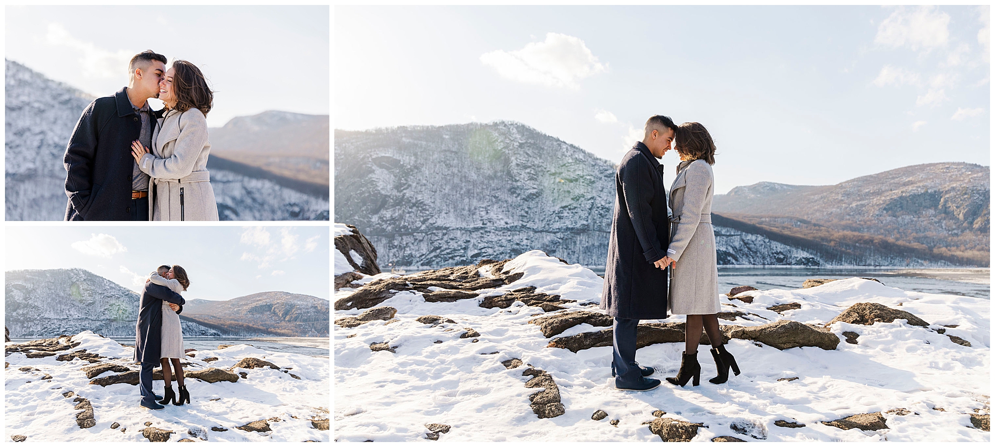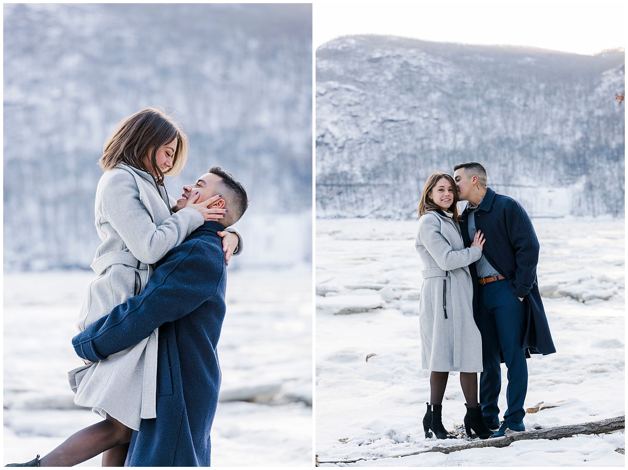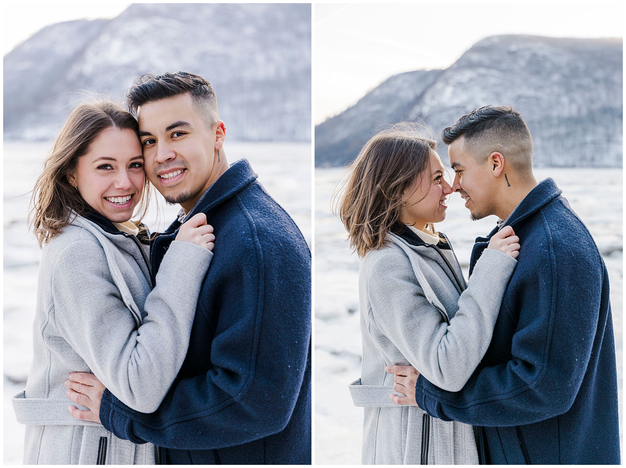 We began the session at the overlook at Little Stony Point. This is one of our favorite spots for Hudson Valley engagement photography. The view from the top is absolutely worth the climb. We could see the Hudson River stretching out below us. Ice was breaking up along the shoreline, creating incredible texture. The snow-covered mountains in the background added dramatic depth. Cold Spring and the surrounding Hudson Highlands looked like a winter wonderland.