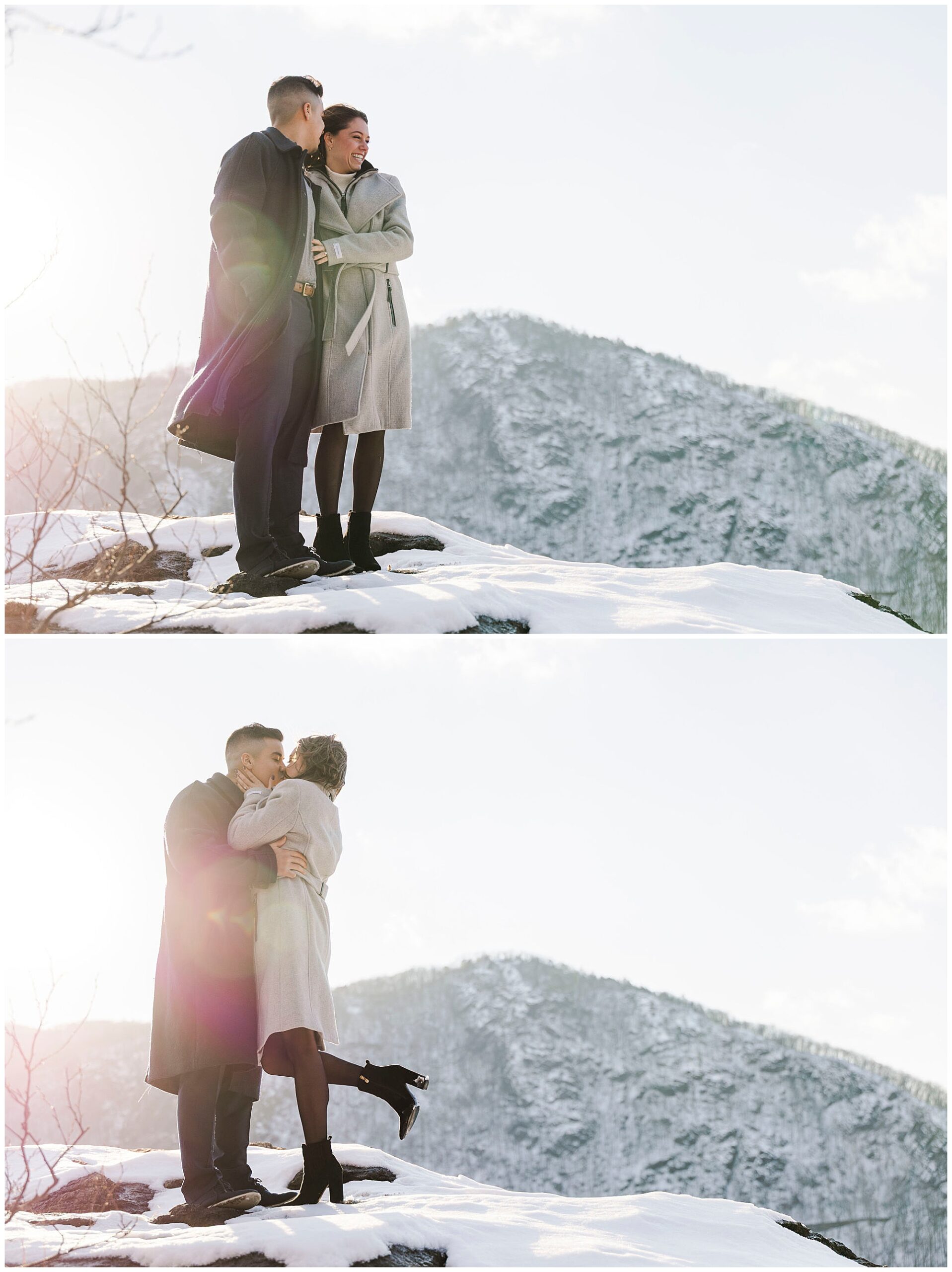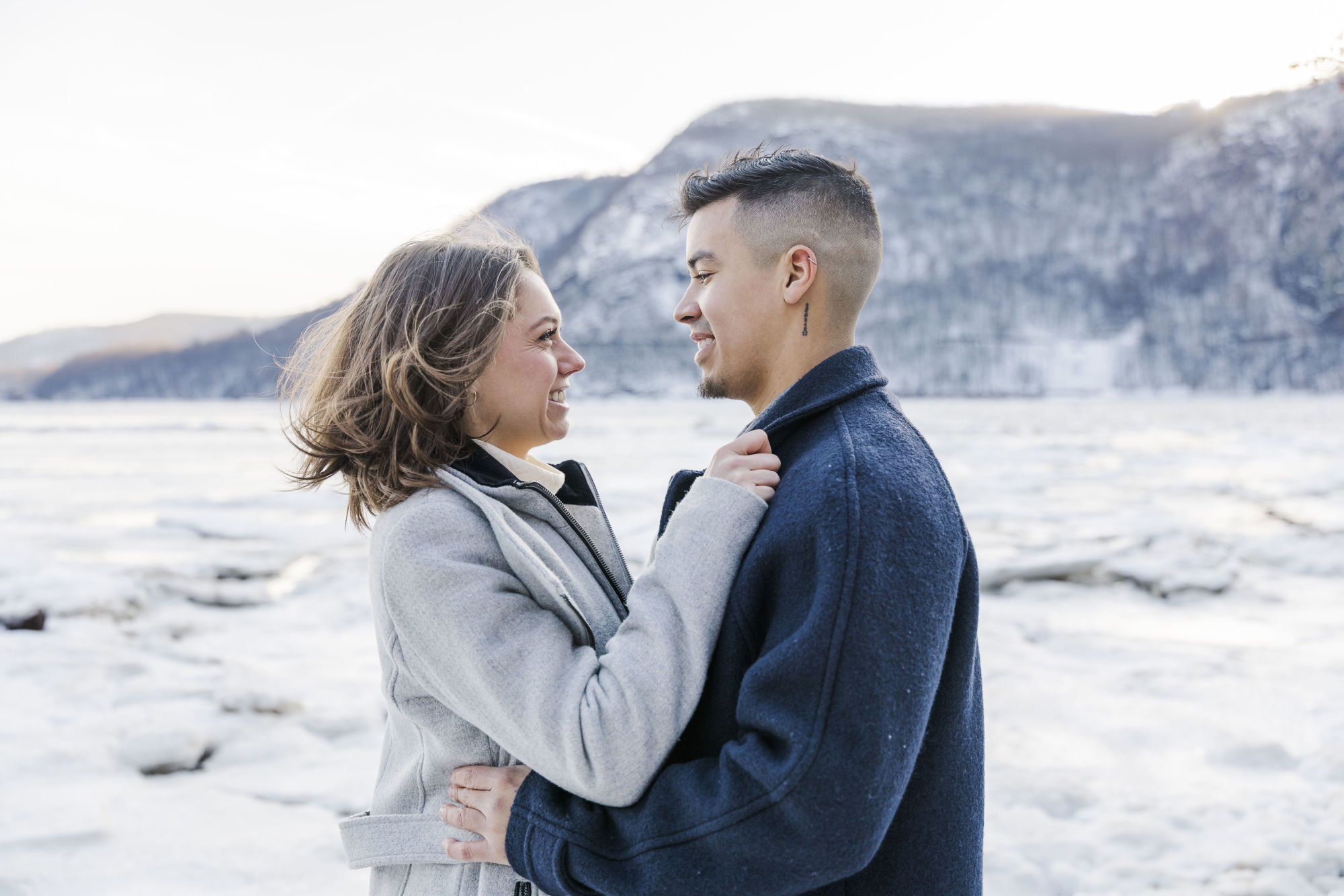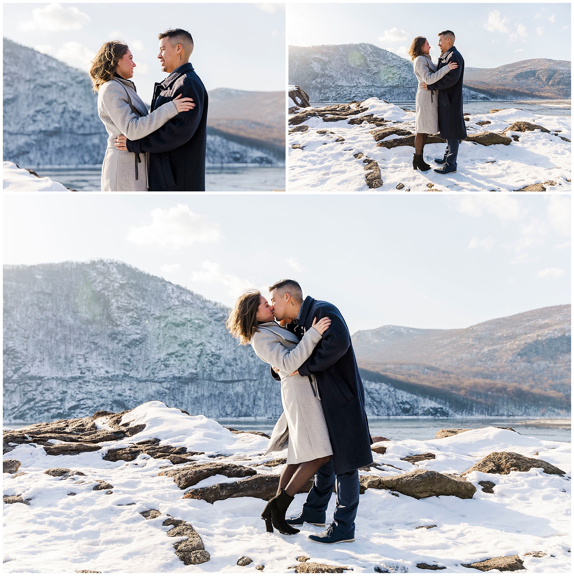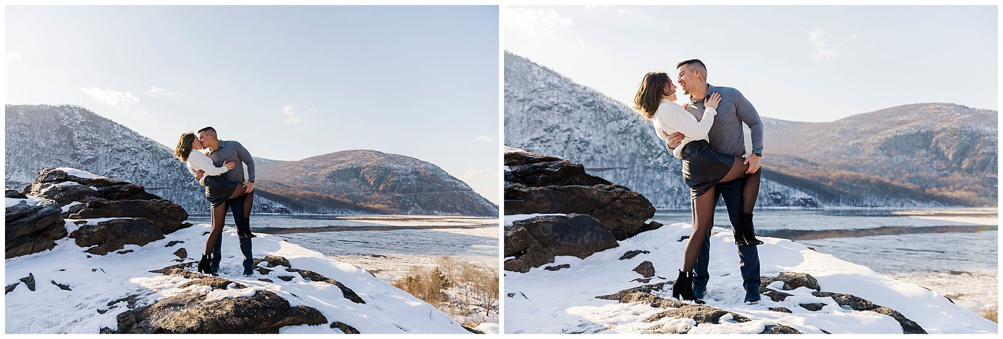 We began the session at the overlook at Little Stony Point. This is one of our favorite spots for Hudson Valley engagement photography. The view from the top is absolutely worth the climb. We could see the Hudson River stretching out below us. Ice was breaking up along the shoreline, creating incredible texture. The snow-covered mountains in the background added dramatic depth. Cold Spring and the surrounding Hudson Highlands looked like a winter wonderland.
