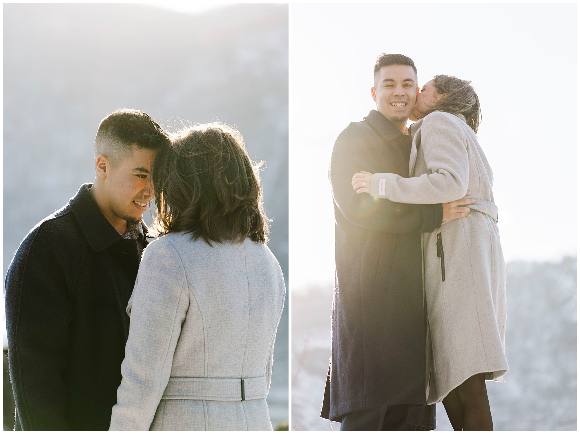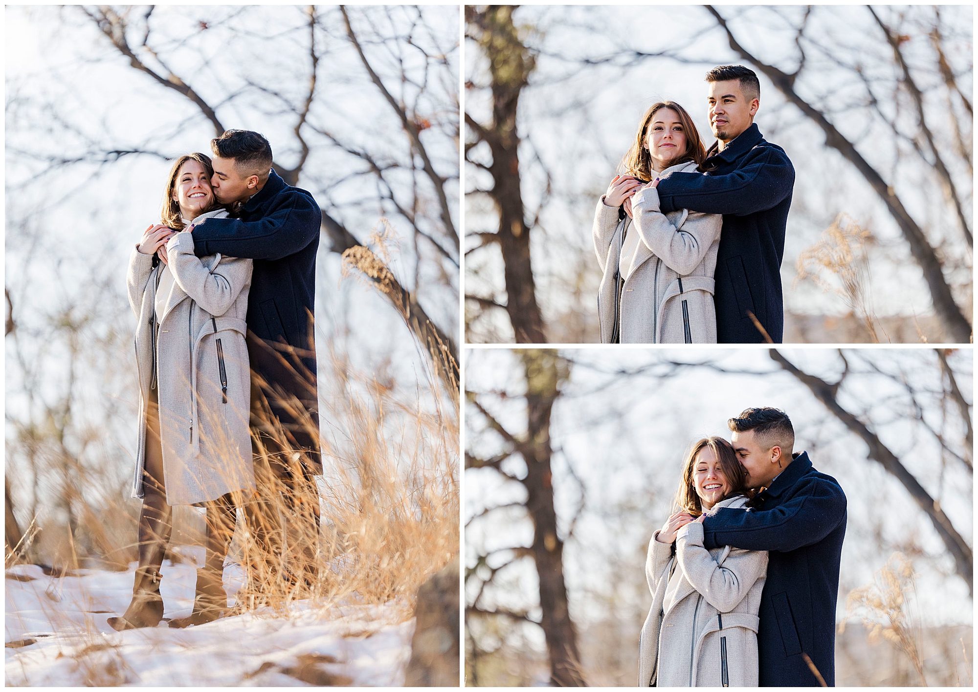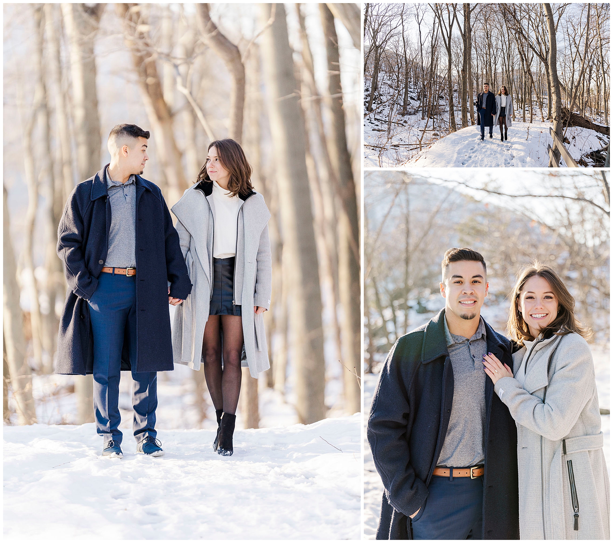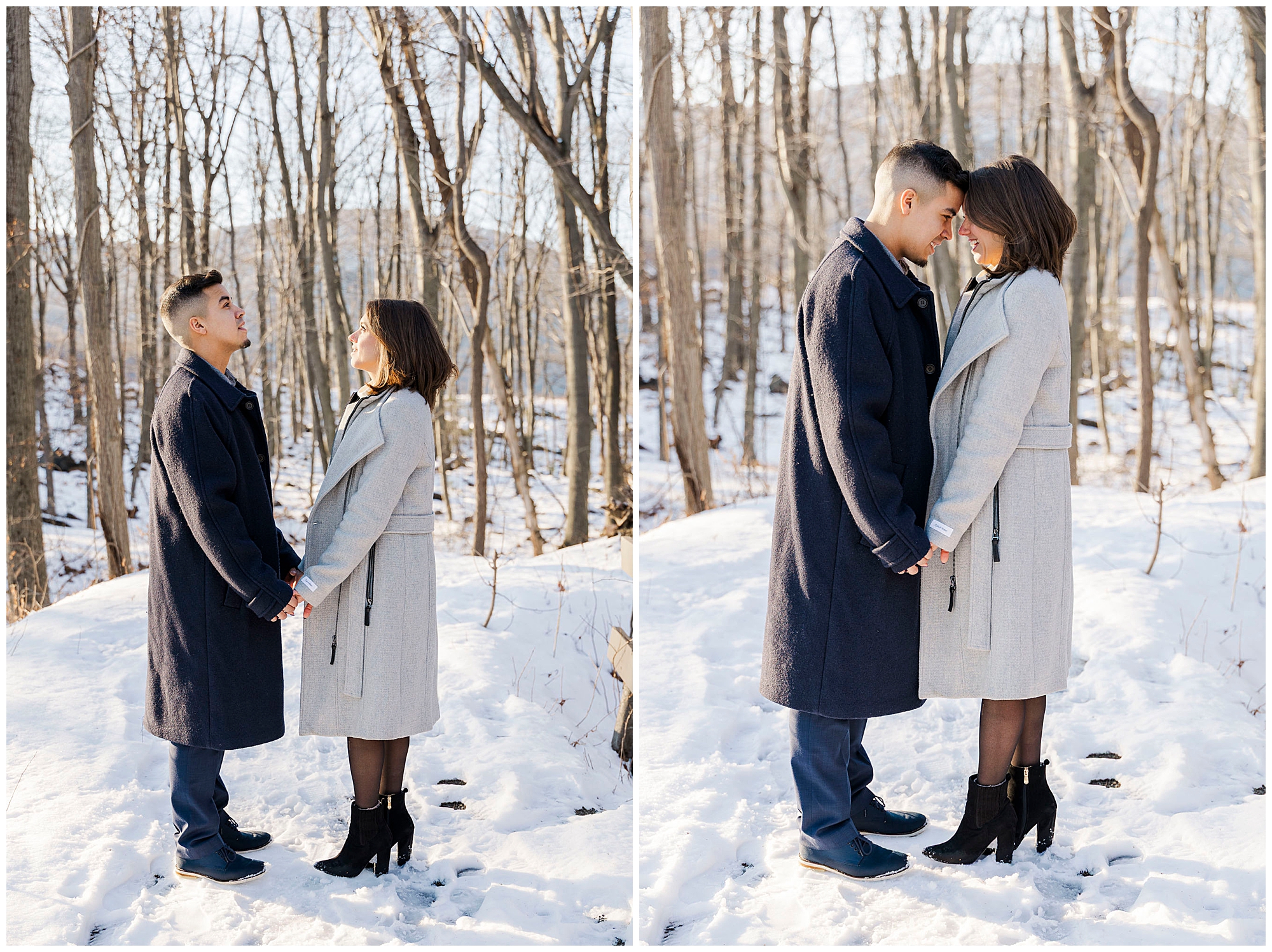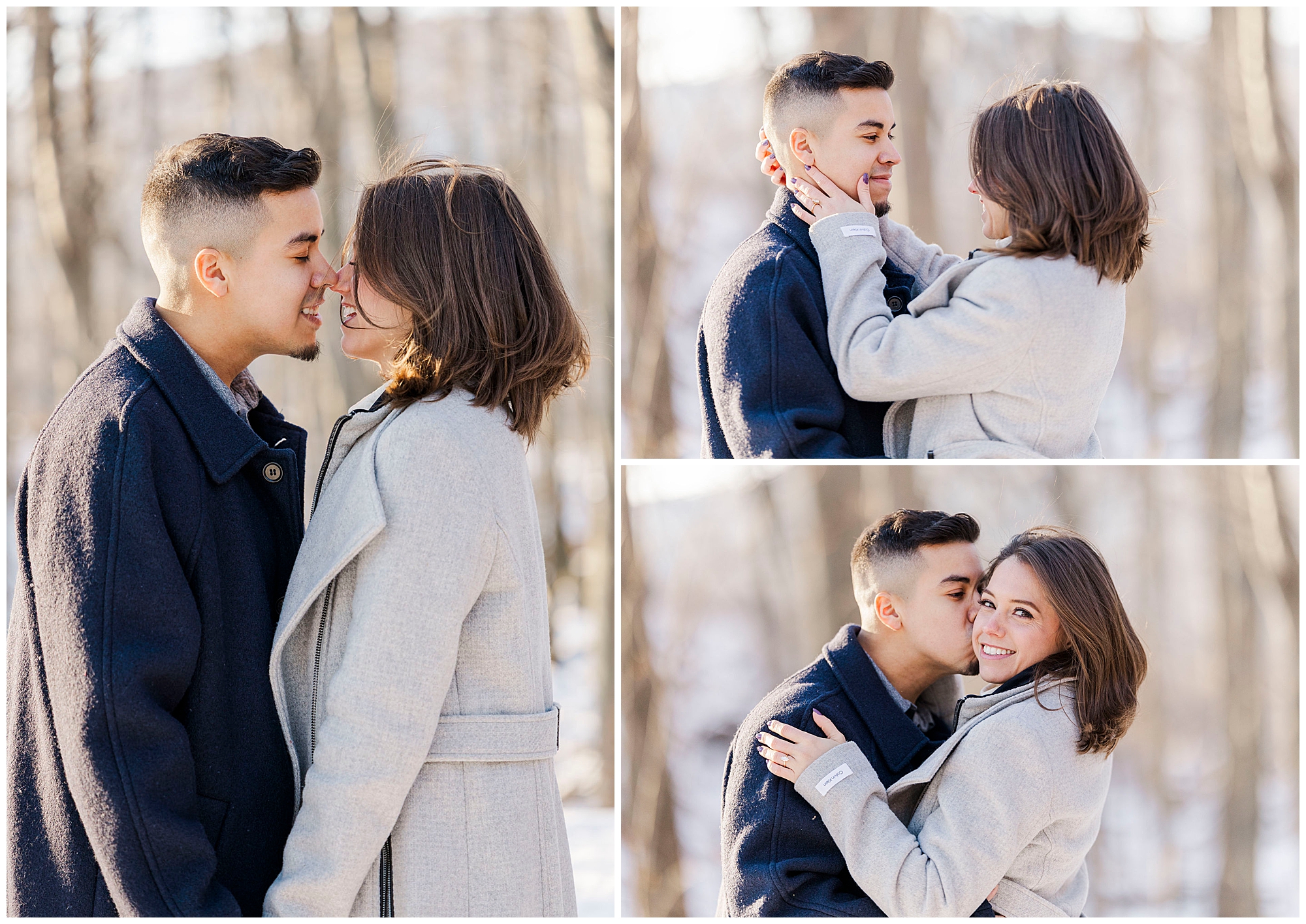 We admire couples who embrace winter for their engagement photos. Caroline and Ernesto bundled up in gorgeous wool coats for the occasion. She looked stunning in her belted gray coat and sleek black booties. He matched perfectly in his navy peacoat. These two were absolute troopers throughout the chilly afternoon. Their willingness to brave the cold resulted in truly breathtaking images.