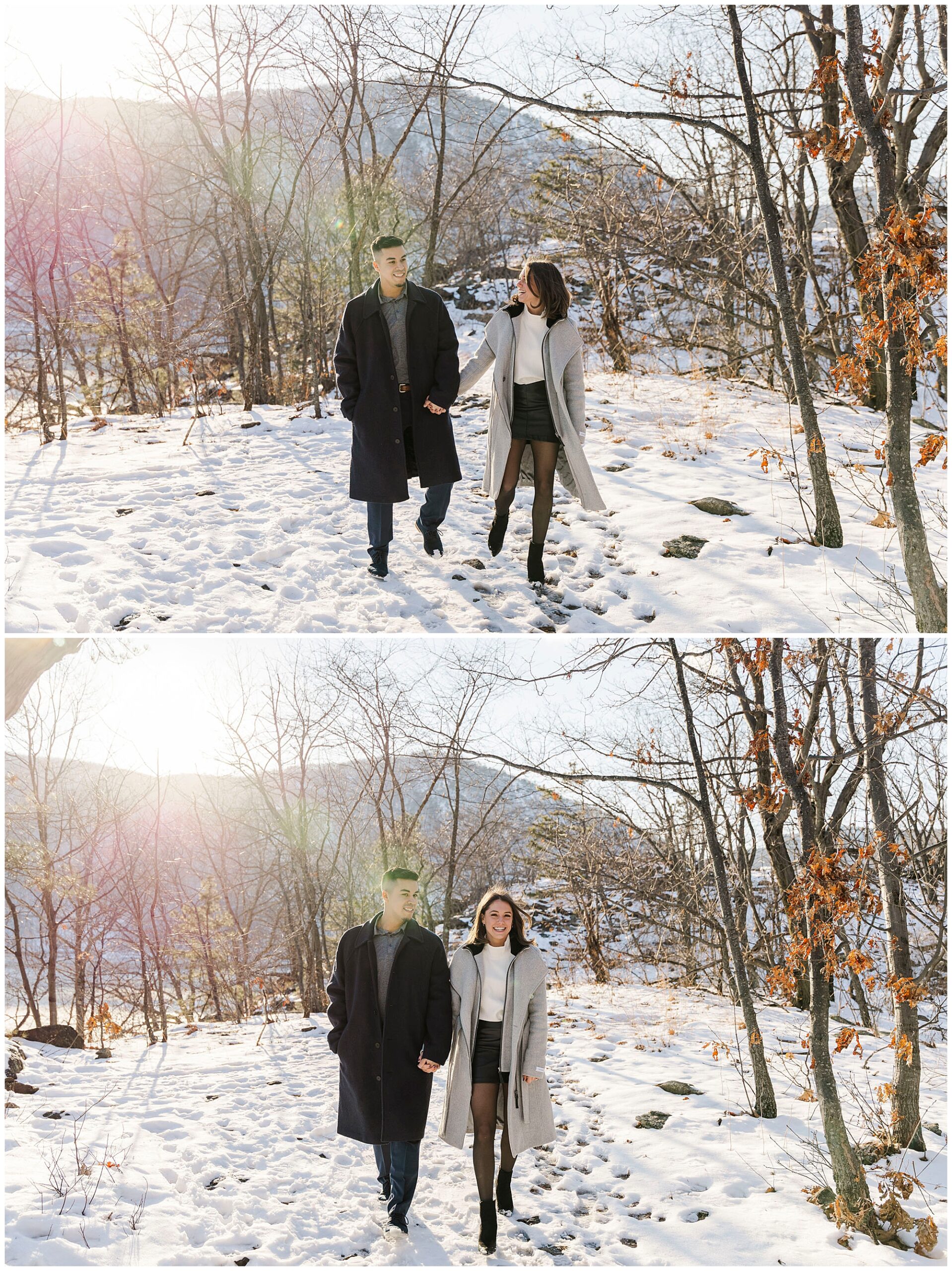 After capturing the overlook views, we headed down the trail. The bare winter trees created beautiful patterns against the sky. This part of the engagement session felt intimate and romantic. Snow crunched beneath our feet as we explored. Little Stony Point offers so many varied backdrops. One moment you have sweeping river views. The next, you are surrounded by peaceful forest.